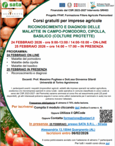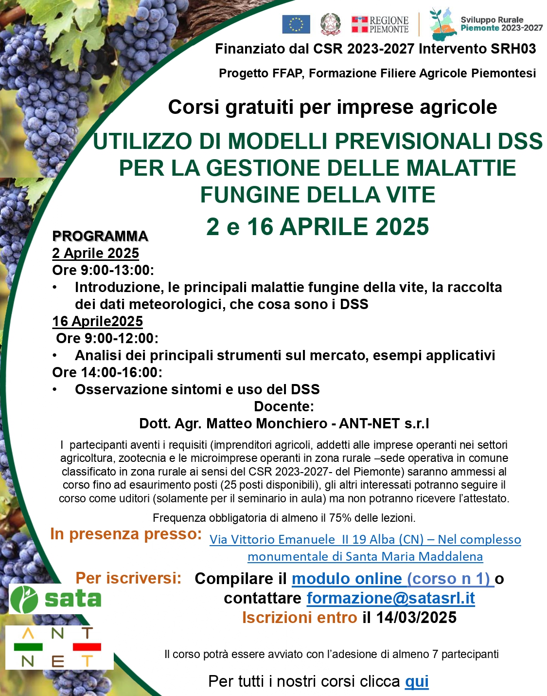 Il corso sarà incentrato in particolare sulla peronospora della vite. Saranno mostrati i trattati i principali modelli previsionali (DSS) e il loro utilizzo. Sarà fatto un focus sul riconoscimento e sulla diagnosi della malattia tramite formazione in aula e in campo, attraverso la visita alle prove dell’Università degli Studi di Torino o a presso aziende agricole dell’astigiano/tortonese.